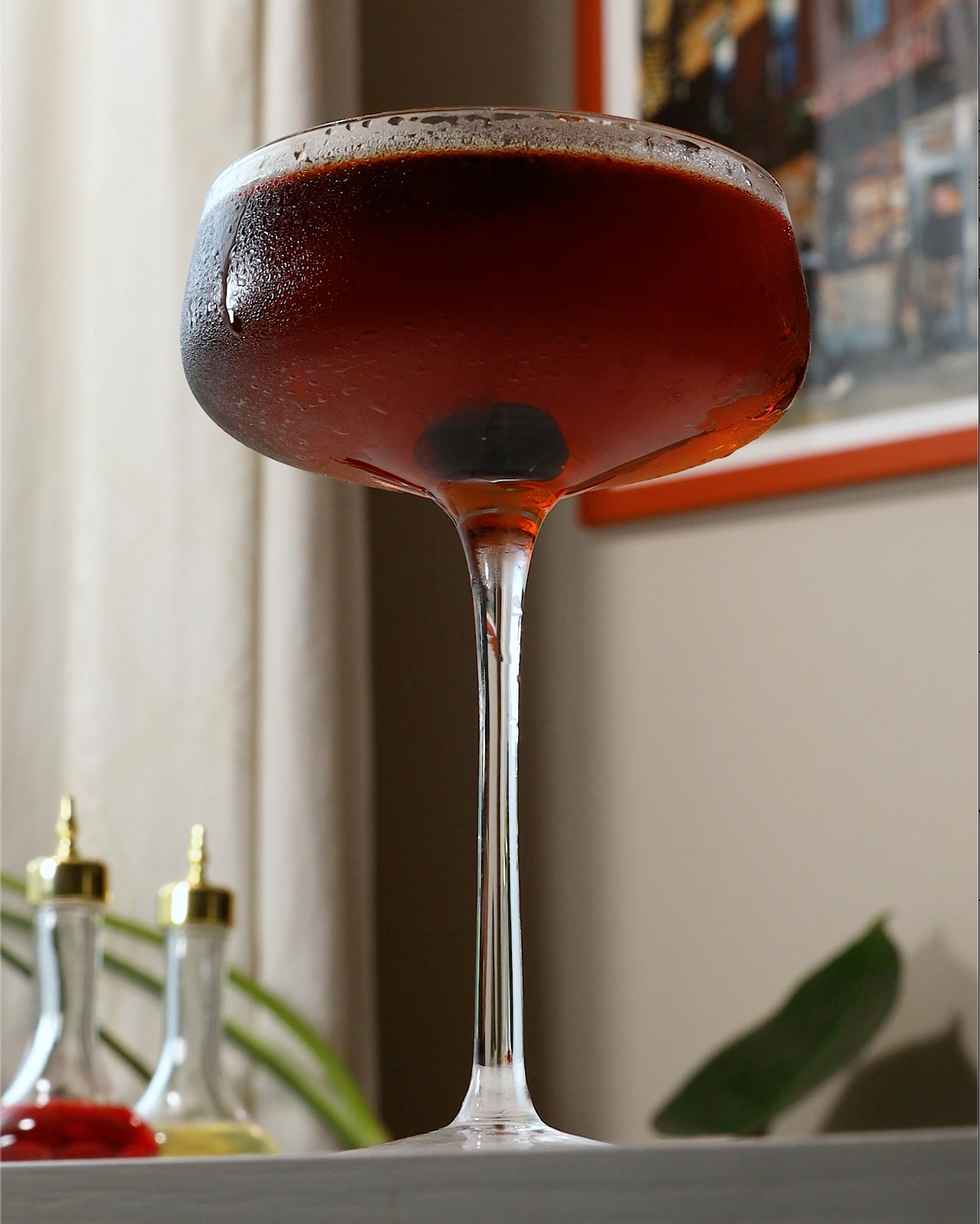 Orange twist (expressed and discarded) and maraschino cherry for garnish